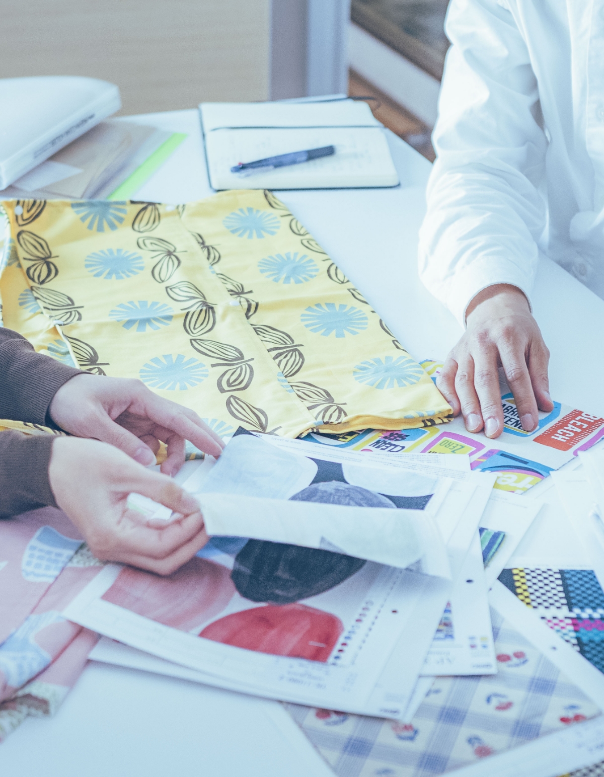 - 実際に各生地メーカーへ足を運び、現物を見て触れて、企画に沿った生地を選定しています。